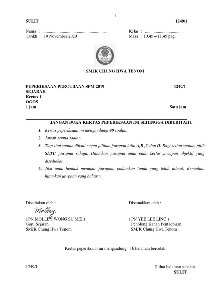 Kertas soalan trial papers sejarah kertas 1, 2 dan 3 beserta skema jawapan buat pelajar . Markah yang diperuntukkan bagi setiap 10 soalan atau ceraian soalan ditunjukkan dalam kurungan. Jawapan anda hendaklah ditulis di dalam kertas jawapan yang disediakan. Peperiksaan bertulis antara lain melibatkan kertas peperiksaan seperti bahasa melayu, bahasa inggeris, matematik, matematik tambahan, sejarah, pendidikan islam, . Kertas jawapan berasingan yang disediakan. Kertas peperiksaan ini mengandungi satu tugasan spesifik.